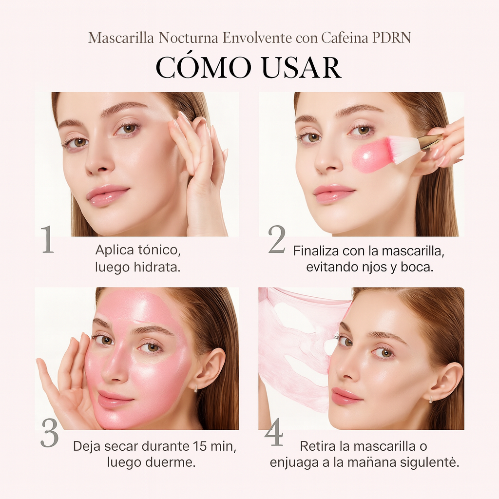 Úsala 3–4 noches/semana como último paso. Aplica una capa fina y uniforme (≈ una almendra), evitando ojos, labios, cejas y línea del cabello. Espera 10–20 min hasta toque seco antes de ir a la cama.