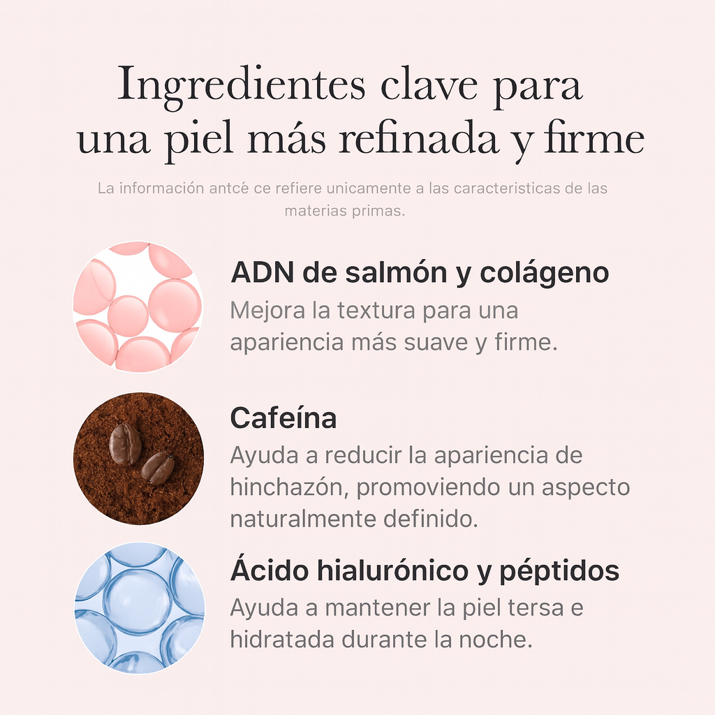 Ni rodillo frío ni maquillaje lo resuelven rápido. La cafeína ayuda a desinflamar, mientras el PDRN apoya la barrera para un look más fresco y definido al amanecer.