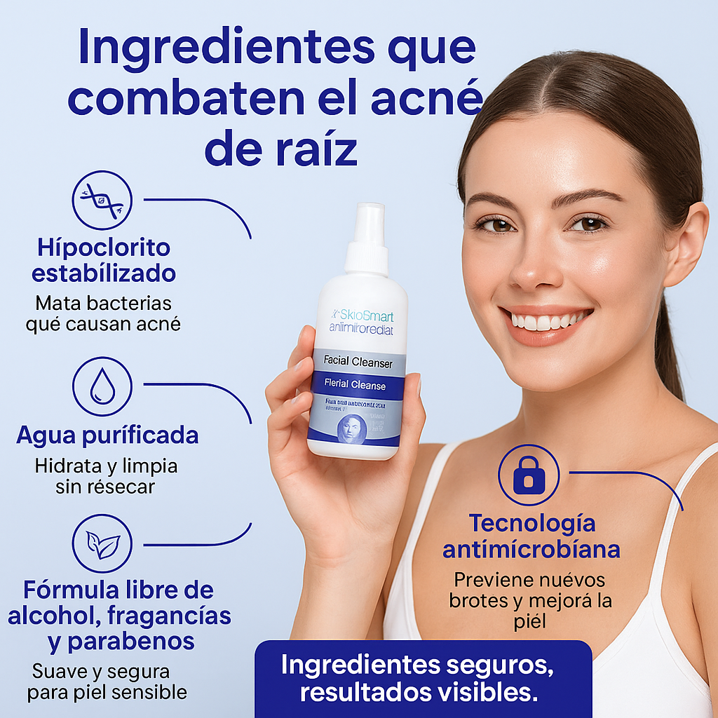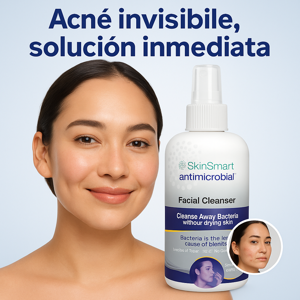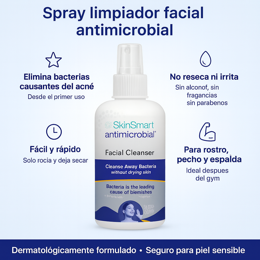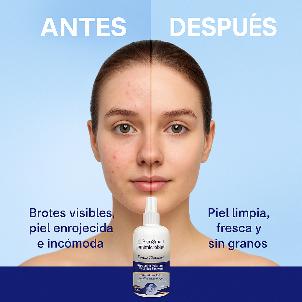SkinSmart es un spray facial y corporal que utiliza ácido hipocloroso, un ingrediente seguro y de origen natural, para eliminar las bacterias que causan el acné. Se aplica directamente sobre la piel y se deja secar al aire, sin necesidad de enjuague.