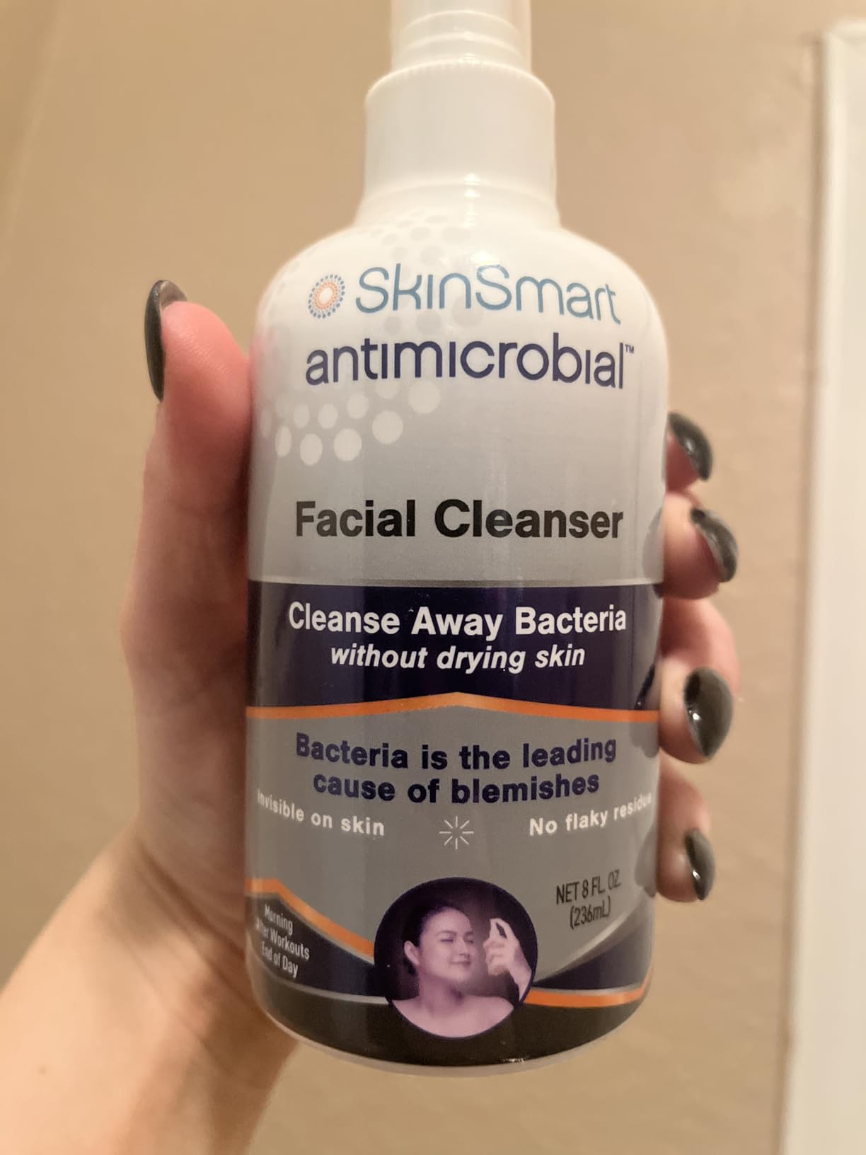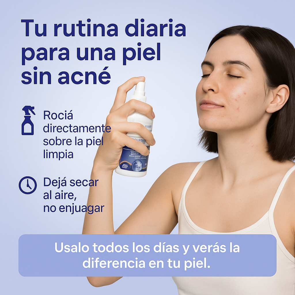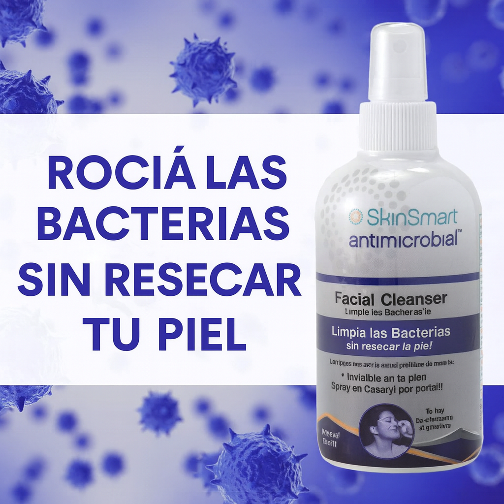 SkinSmart es un spray facial y corporal que utiliza ácido hipocloroso, un ingrediente seguro y de origen natural, para eliminar las bacterias que causan el acné. Se aplica directamente sobre la piel y se deja secar al aire, sin necesidad de enjuague.